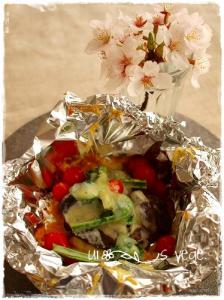 アルミホイルに味噌を塗り、椎茸・茹でたこごみ・プチトマトを乗せる。