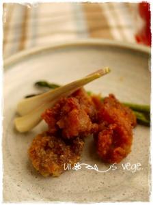 冷蔵庫で半日漬け込んだら、余分な醤油ダレを捨て鶏肉をボウルに入れて米粉を全体に塗して油で揚げる。