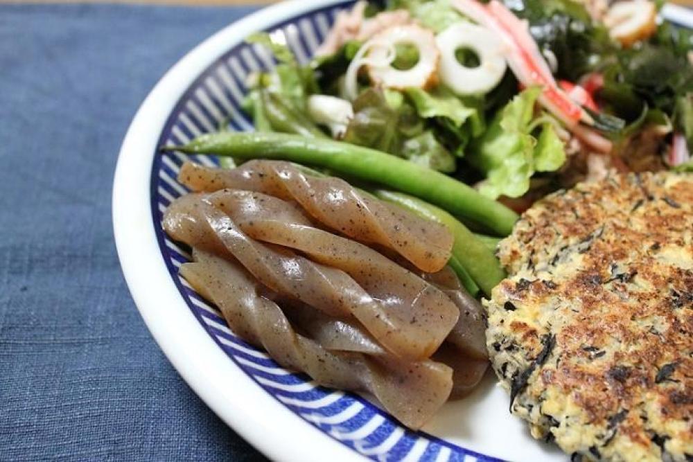 いんげんとねじったこんにゃくをめんつゆで、落し蓋をしながら煮込んだら出来上がり。