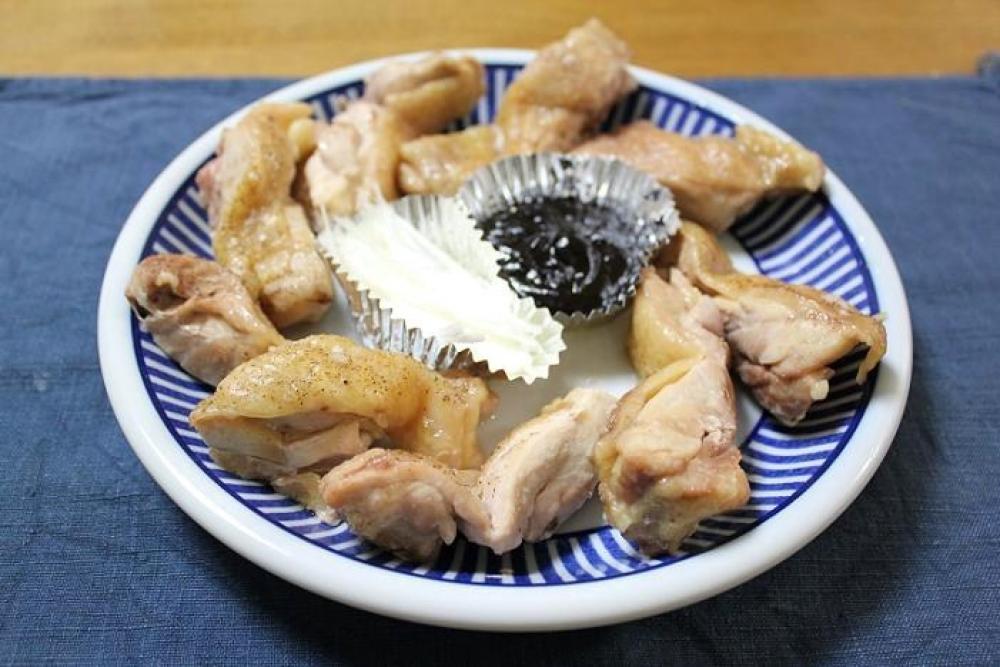 鶏もも肉を一口大に切り、塩コショウをしてスチームケースに入れ、7分ほど電子レンジで加熱します。