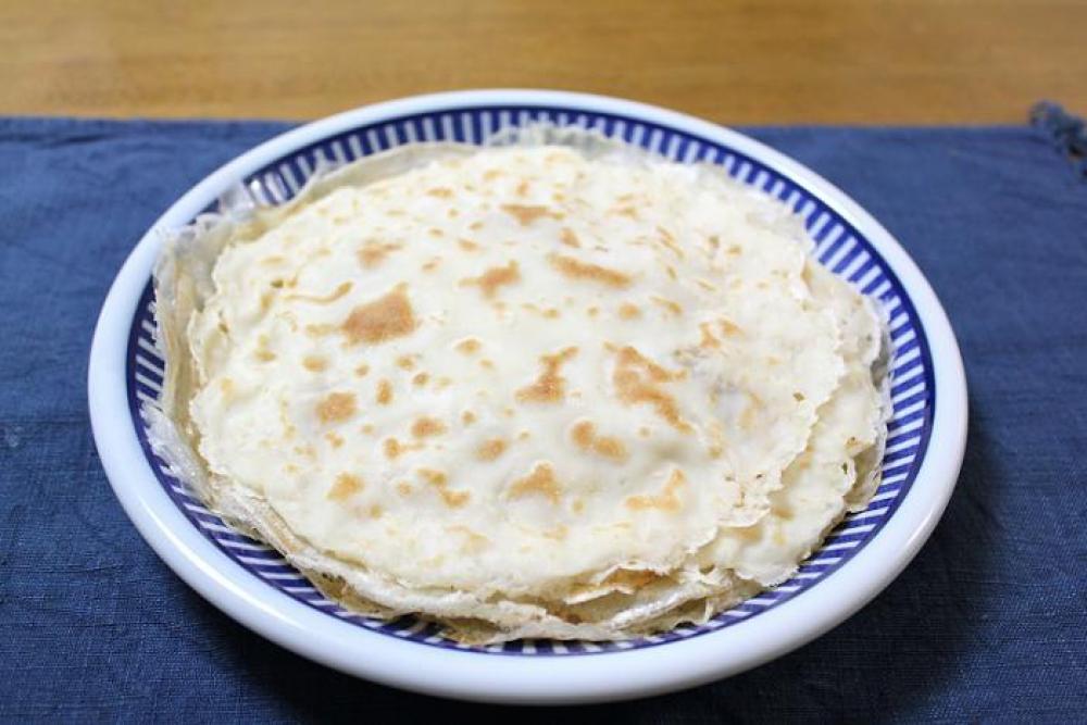 ![]() 練った小麦粉はクレープと同じように、フライパンで薄く伸ばして両面を焼いて薄餅を作ります。
