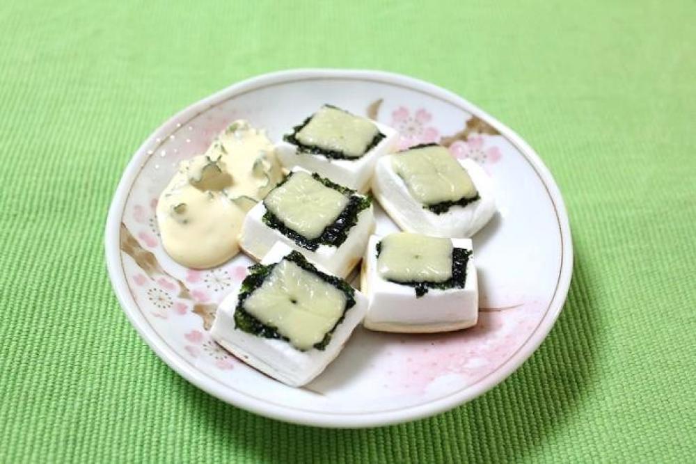 はんぺんに海苔、スライスチーズをのせ、油をひかずにテフロンのフライパンで焼きます。