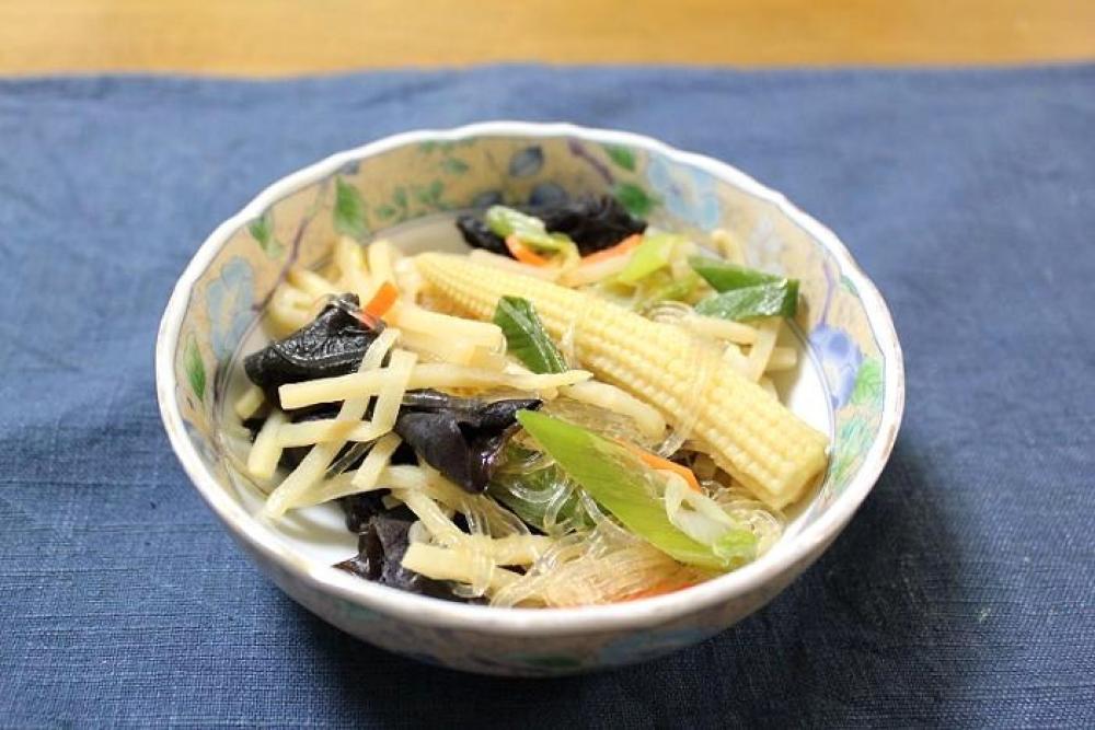 油を熱したフライパンで、長ねぎ・人参・きくらげ・ヤングコーン・細切りたけのこを炒めます。