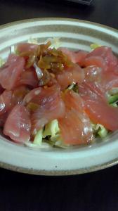 レタスやキュウリ、スライス玉ねぎなど、お好みの野菜の上に、まぐろをのせて、完全に冷めた④をかける。