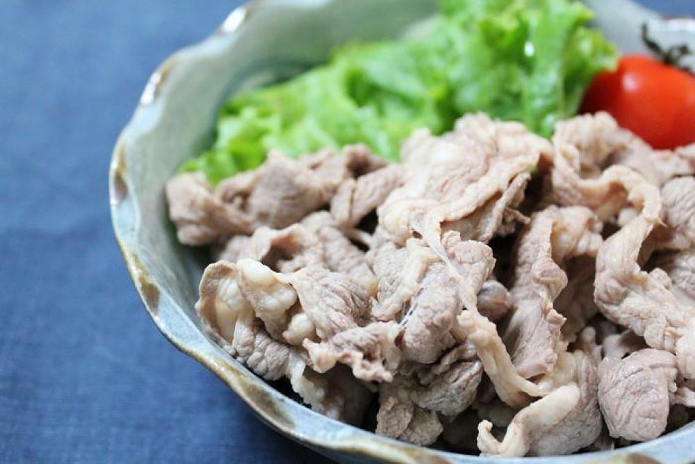 しゃぶしゃぶ用のラム肉を熱湯で茹で、冷水で冷やしたら水気をしっかりと切ります。