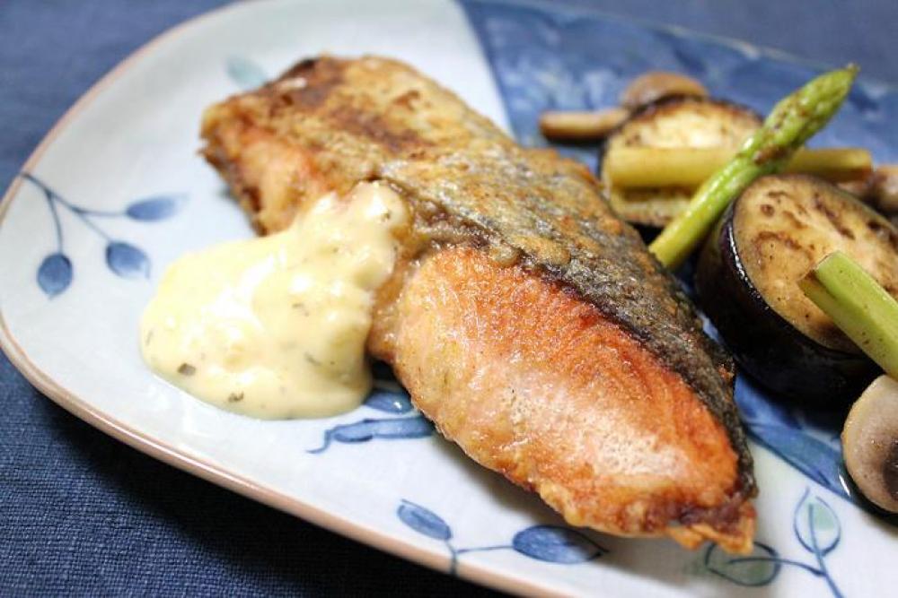 お皿に秋鮭のカレームニエルをのせ、タルタルソースを添えたら出来上がり。