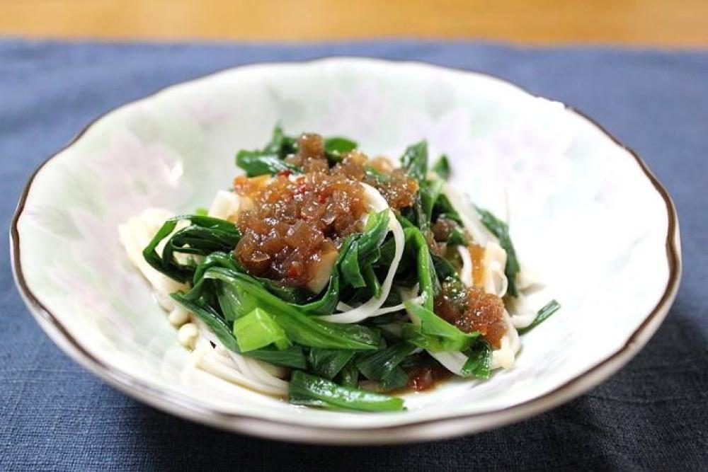 お皿にニラ・えのきを盛りつけ、玉ねぎドレッシングをかけたら出来上がり。