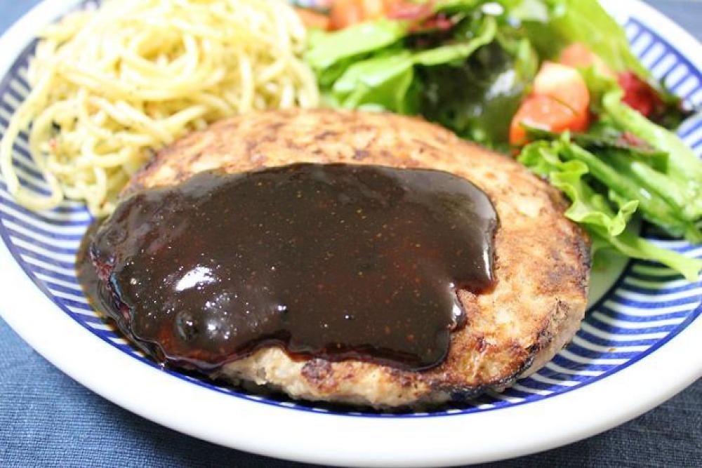 お皿にハンバーグを盛りつけ、ソースをかけたら出来上がり。