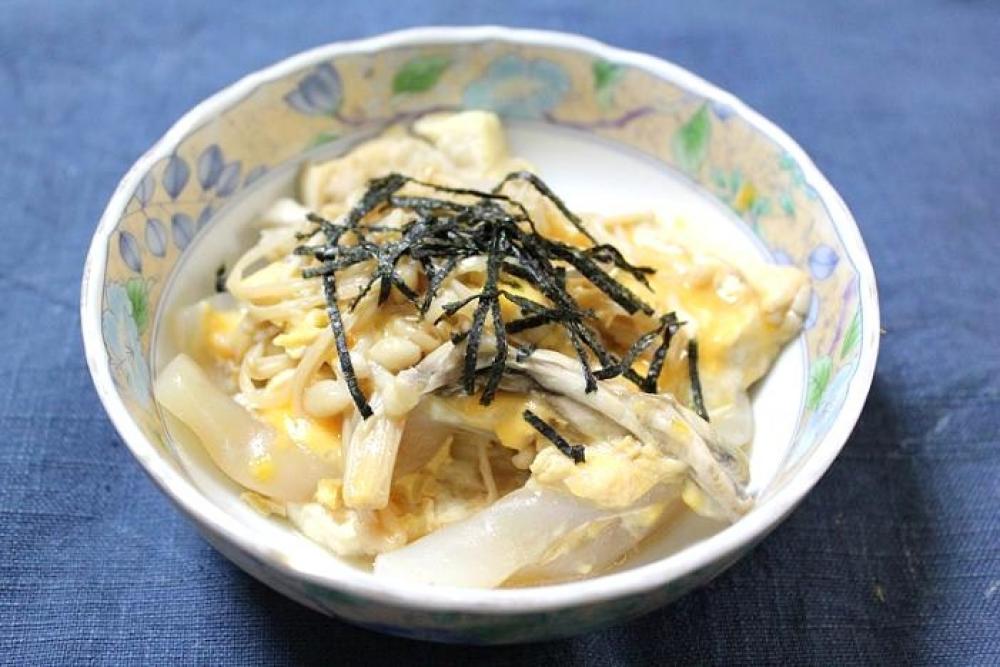 溶き卵を流し込み、フタをして火を止め、蒸らしたら出来上がり。