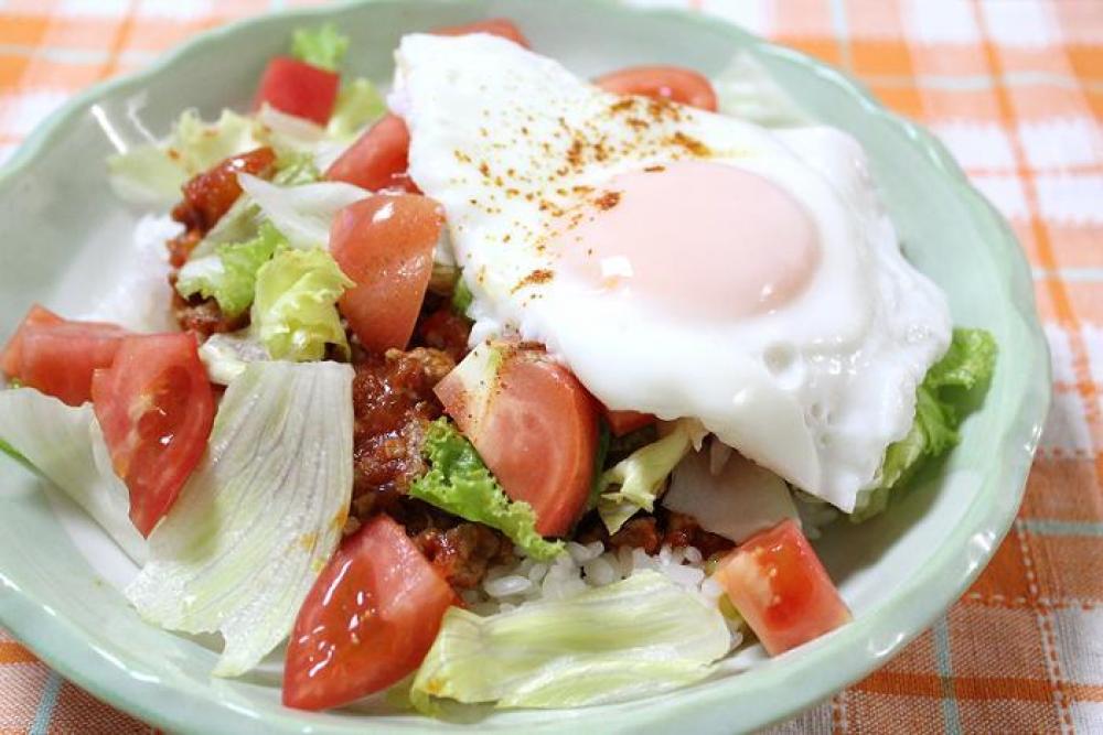 ごはんに挽肉、レタス、トマト、半熟目玉焼きを順にのせたら出来上がりです。