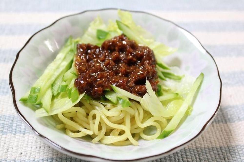 お皿に炒めた麺を盛り付け、小さくちぎったレタス・きゅうりの千切り・肉味噌をのせたら出来上がり。