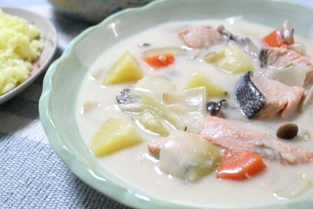 秋鮭・玉ねぎ・人参・じゃがいも・しめじを1口大に切り分けます。
