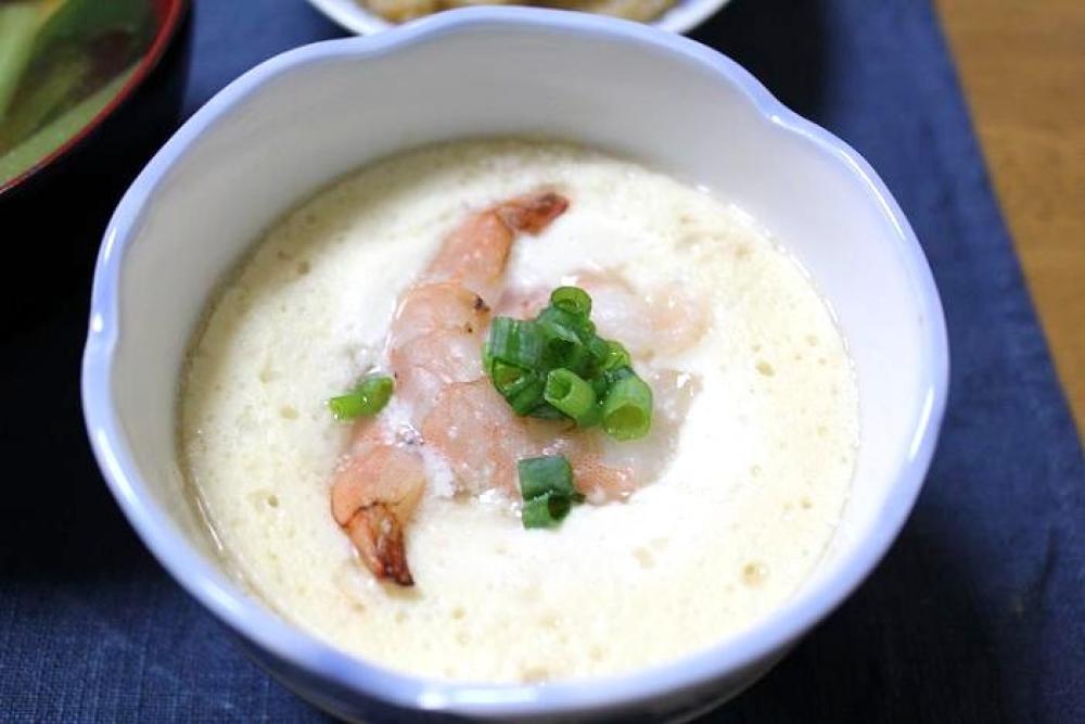 水・めんつゆ・むきエビを上にのせ、レンジで3分加熱します。