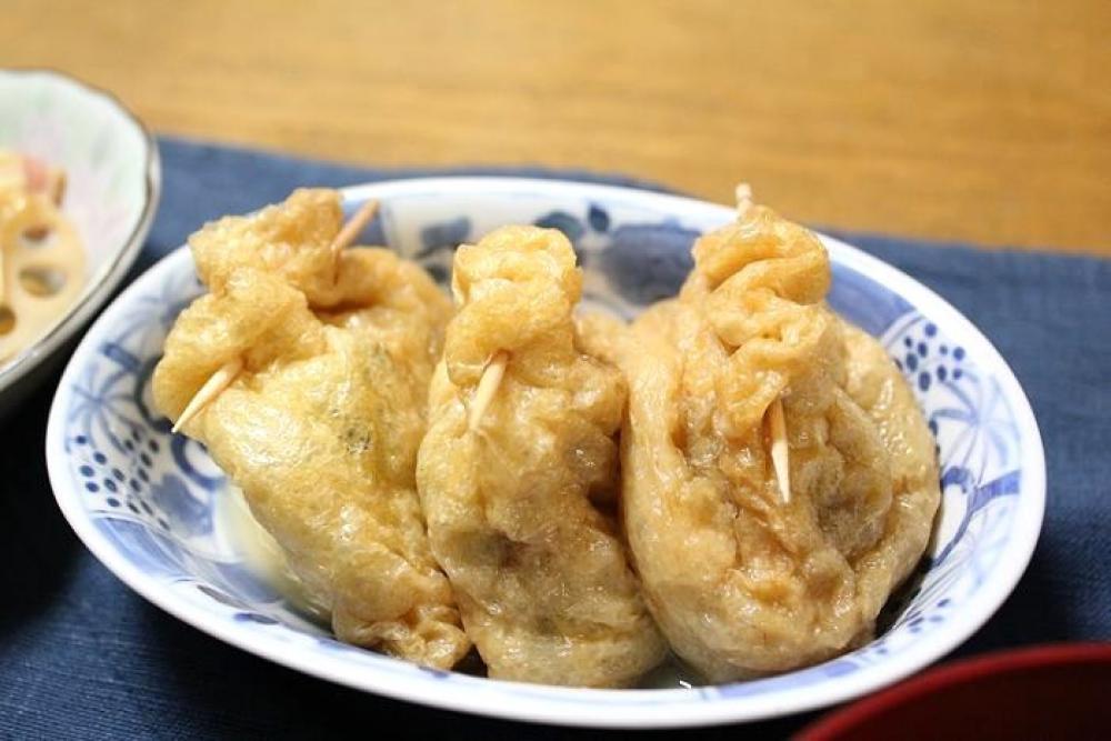 袋状にした油揚げに、餅・鶏団子・いんげん・肉味噌を入れて爪楊枝で縫うように止めます。