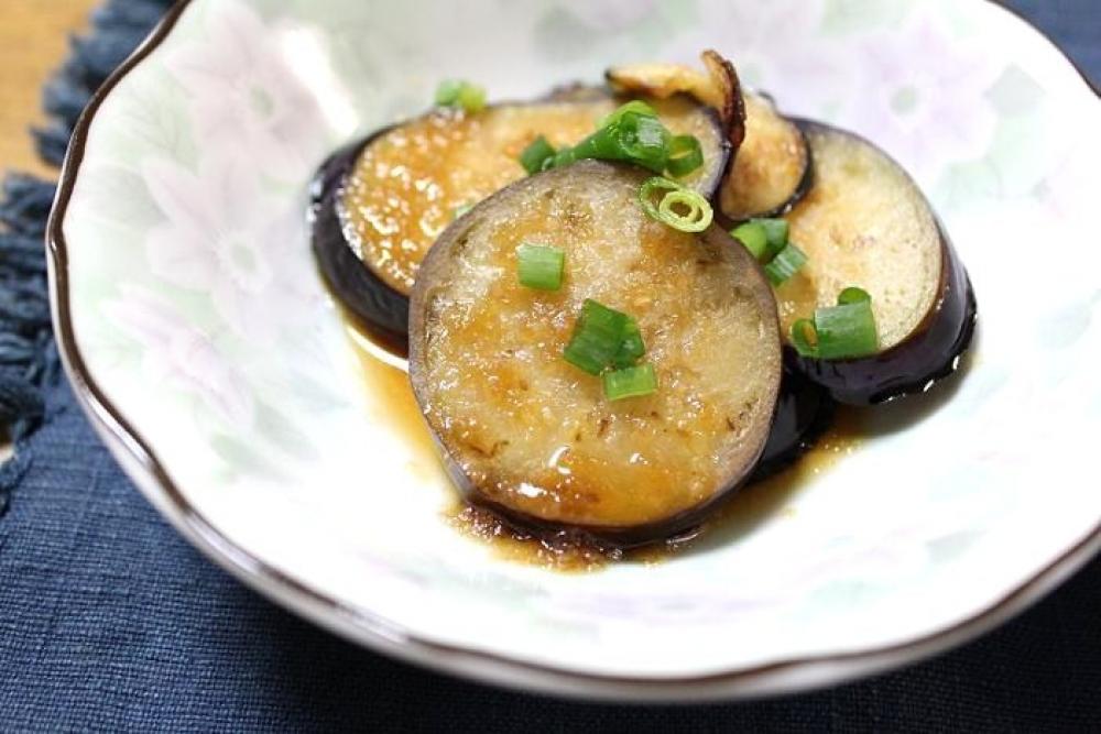 輪切りにした茄子を、ごま油を熱したフライパンで両面を焼き、おろしだれをかけたら出来上がり。