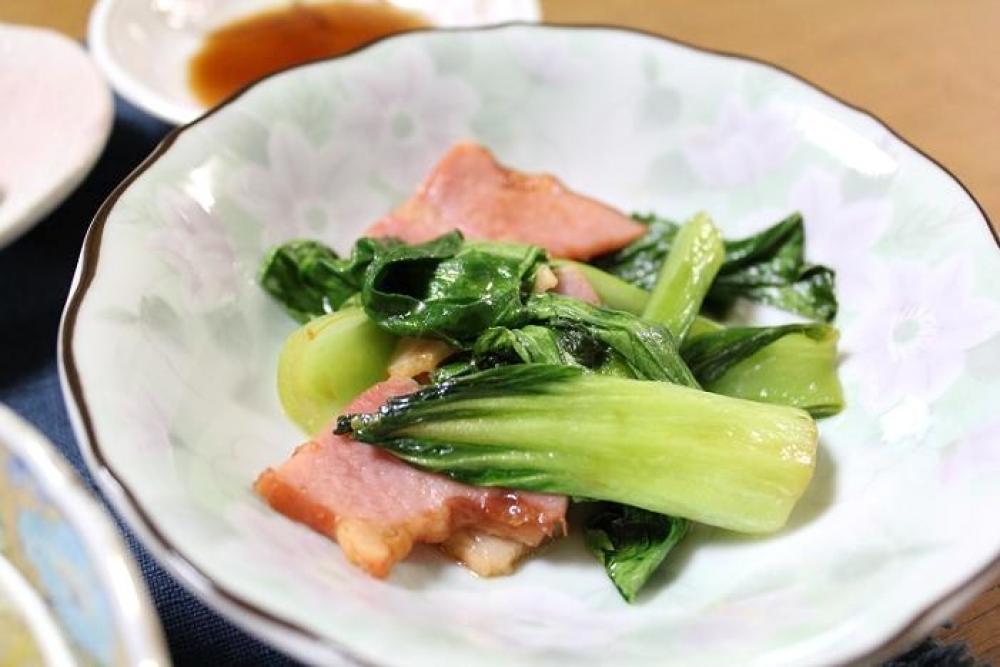 マカダミアナッツオイル を熱したフライパンで、チンゲン菜・ベーコンを炒めます。