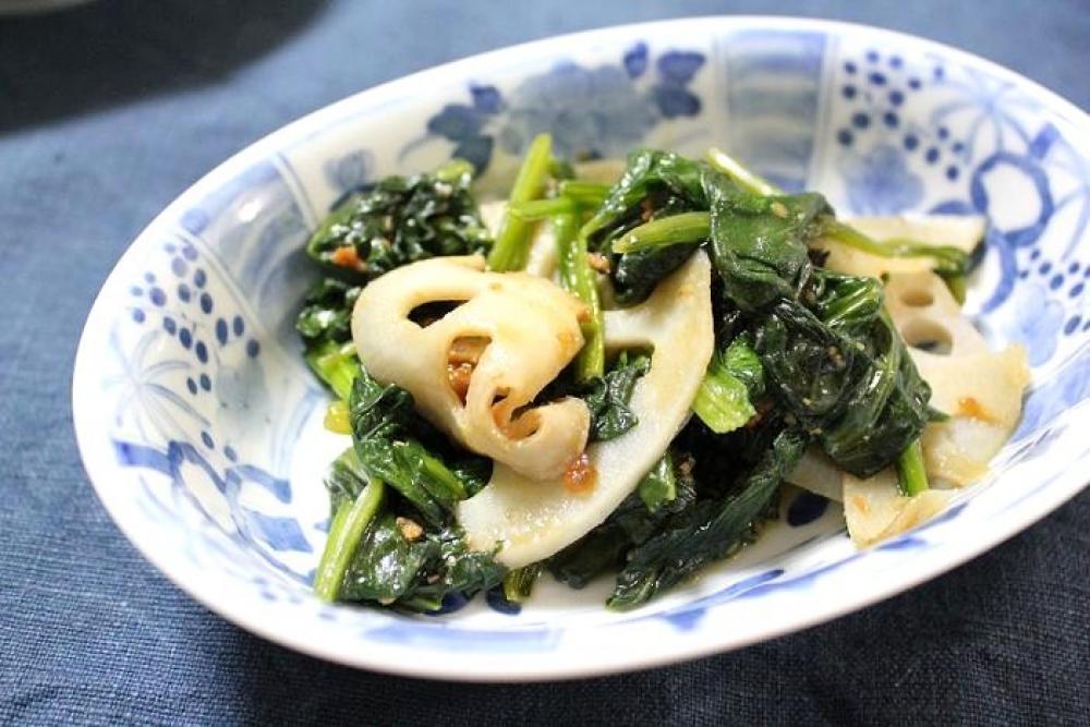 れんこんは薄くスライスし、ほうれん草はざく切りにします。