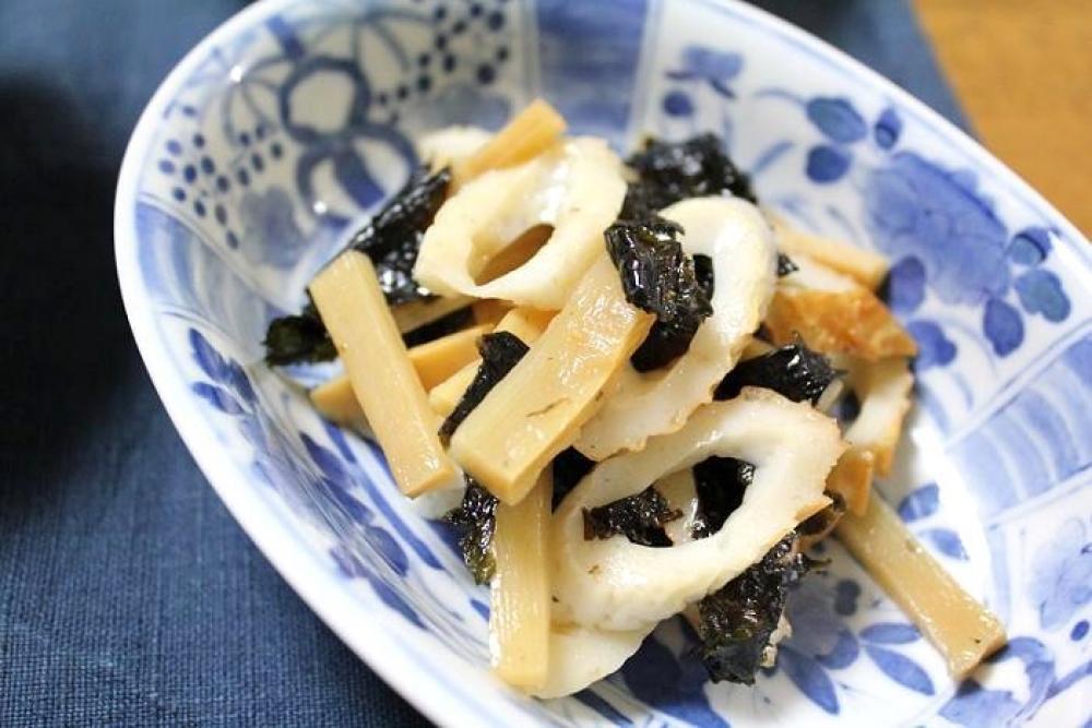 斜め切りにしたちくわ・味付けメンマ・千切った韓国海苔にしょうゆ・ごま油を加え、全体を和えたら出来上がり。