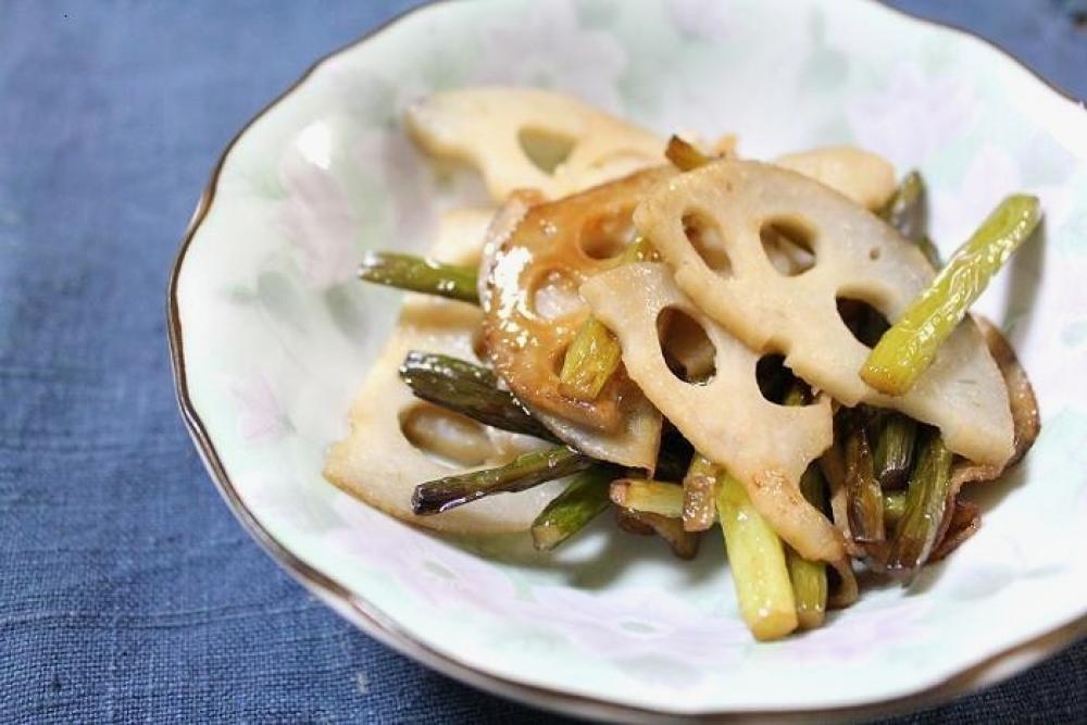 ごま油を熱したフライパンで、れんこんスライス・にんにくの芽を炒めます。