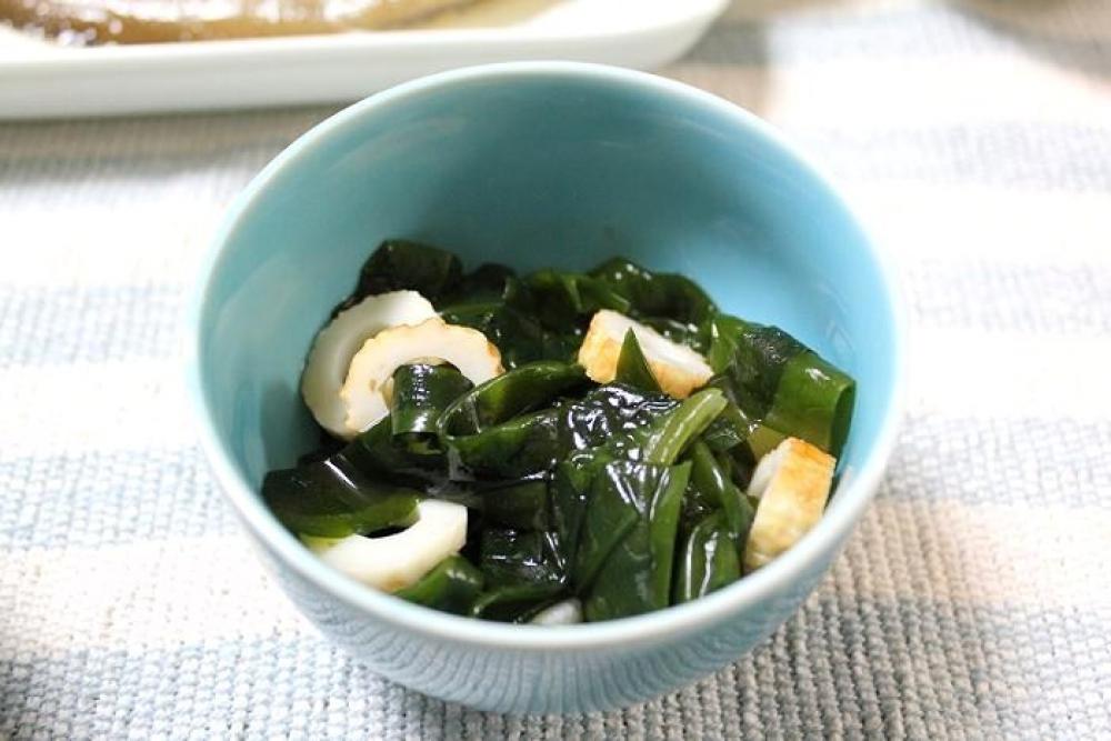 切ったちくわ・わかめに青じそドレッシングをかけ、全体を和えたら出来上がり。