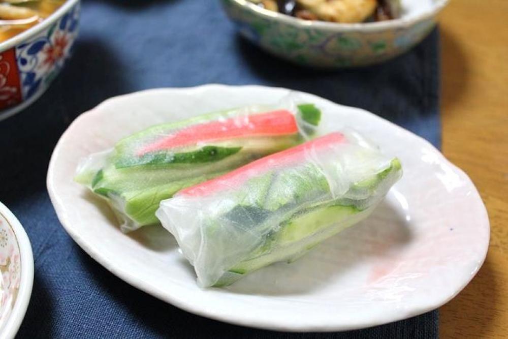レタス・きゅうり・カニカマをライスペーパーで巻いたら出来上がり。※ごまドレッシングでお召し上がりください。
