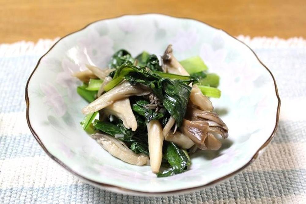 ごま油を熱したフライパンで小松菜・エリンギ・舞茸を炒めます。