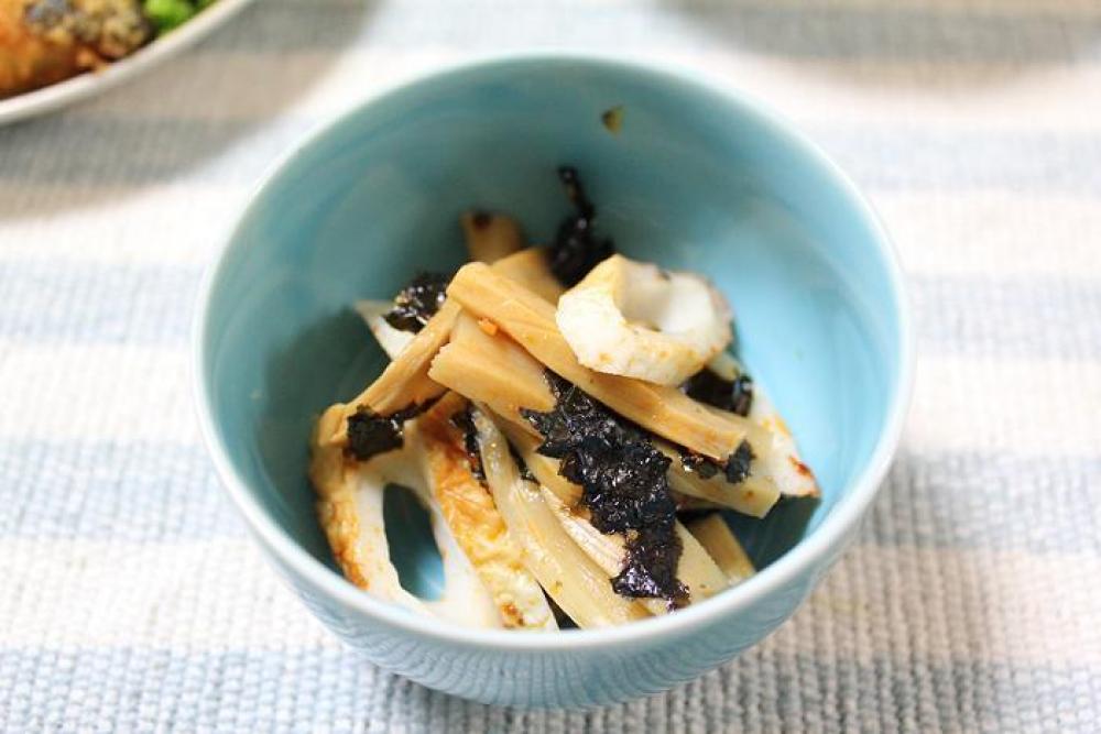味付けメンマ・斜め切りにしたちくわ・千切った韓国海苔・食べるラー油を混ぜ合わせたら出来上がり。