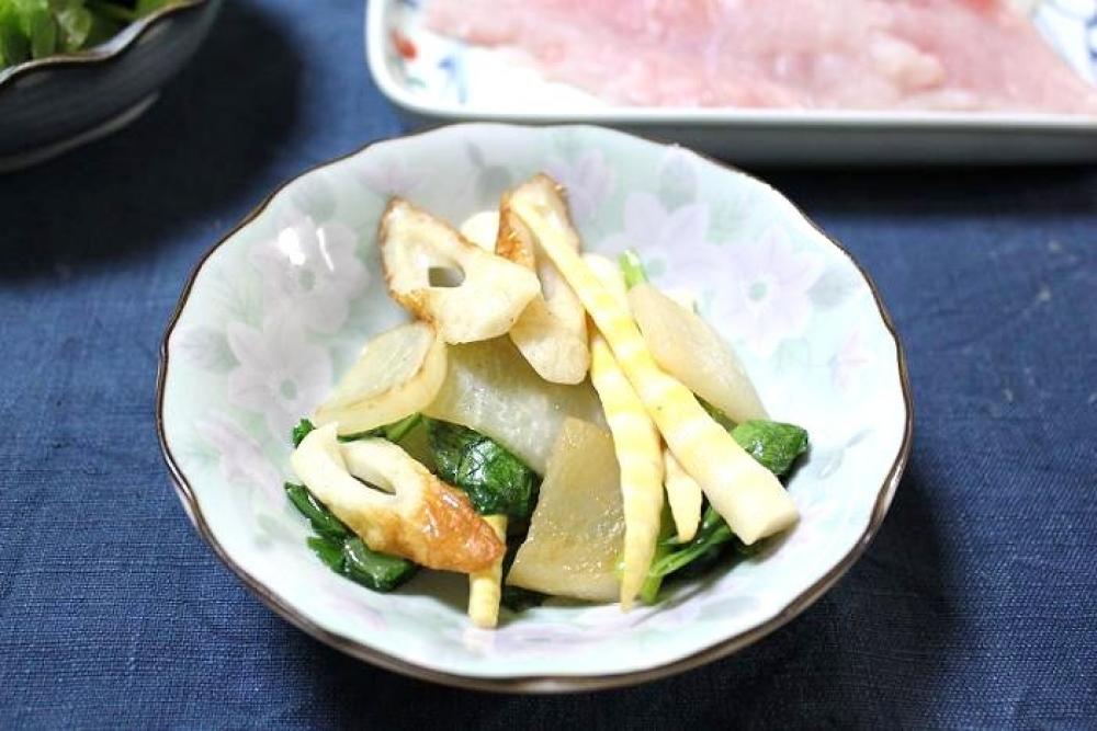 フライパンでごま油を熱し、かぶ・小松菜・ちくわ・細竹を炒めます。