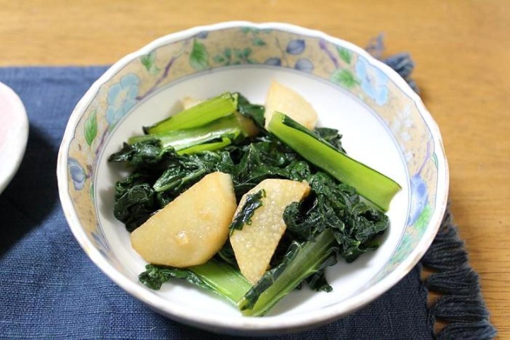 ごま油を熱したフライパンで雪菜・長芋を炒め、オイスターソースを加えて味付けをしたら出来上がり。