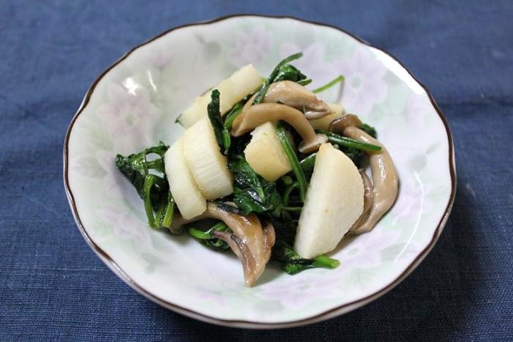 ほうれん草はざく切りに、長芋は皮をむいて半月切りに、しめじは手でほぐします。