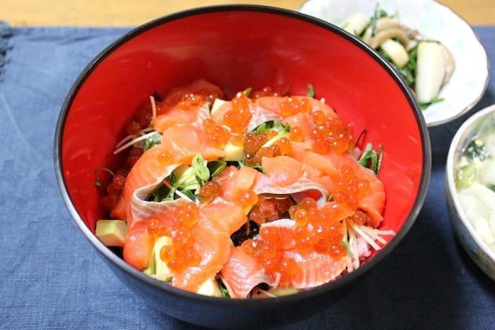 スライスしたサーモン・イクラをさらに上にのせ、ワサビ醤油をかけたら出来上がり。