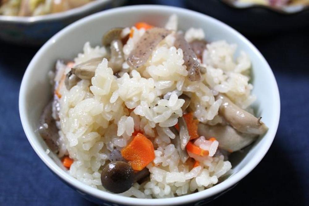 お釜に調味料を入れてから水を加え、お米を炊く分量に調整し、材料を加えて炊きこんだら出来上がり。