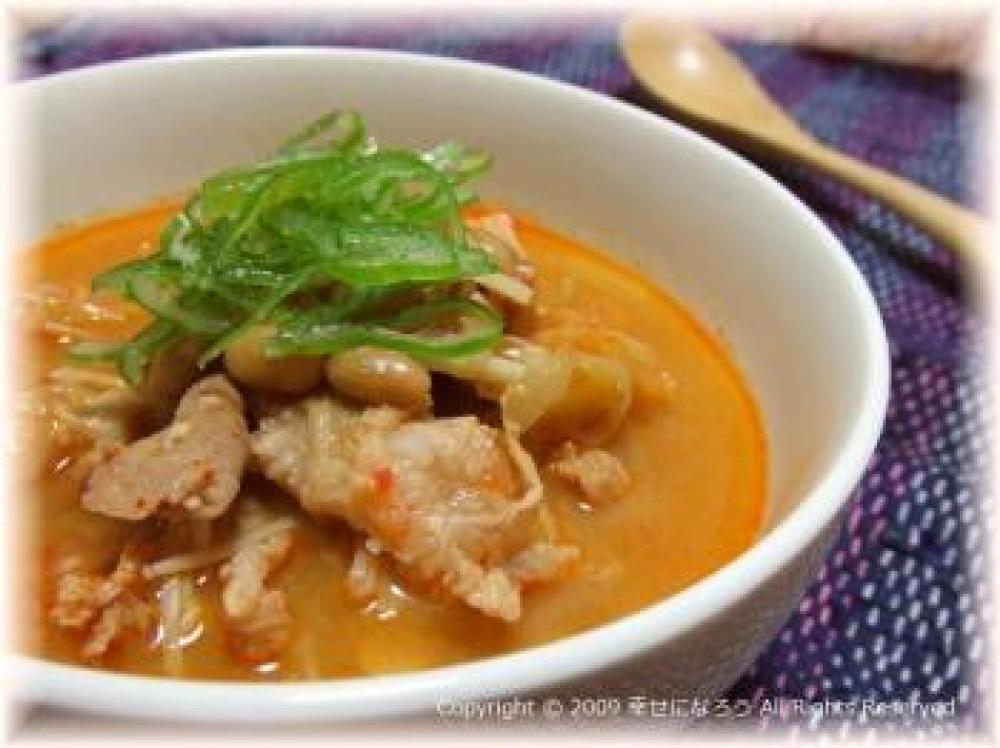 お鍋にごま油を熱して、豚肉、キムチを入れて炒め大体火が通ったら水とスープの素を入れて煮込む。