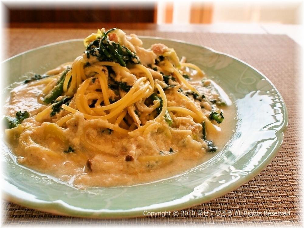 豆乳と水を注ぎ、ウェイパーと白だしを入れて沸騰しないよう温める。固めに茹でたパスタをいれ、好みのかたさまで煮込む。