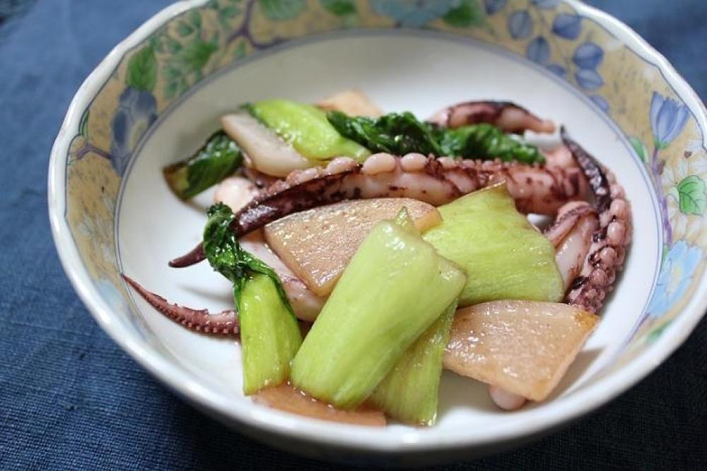 イカゲソは足を切り離し、かぶはいちょう切りに、チンゲン菜はざく切りにします。