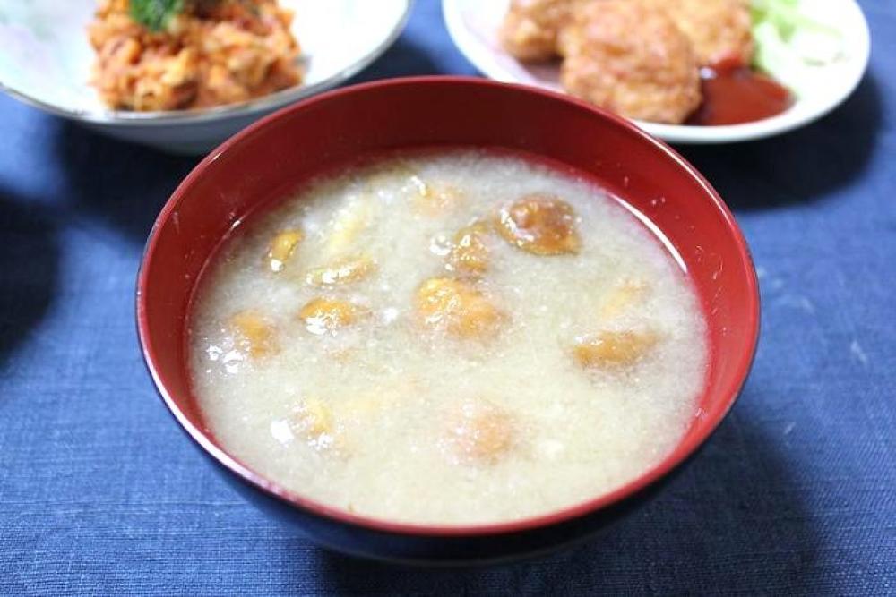 鍋になめこ・だし汁を加えて煮立て、大根おろしを加えて味噌を溶き、一煮立ちさせたら出来上がり。