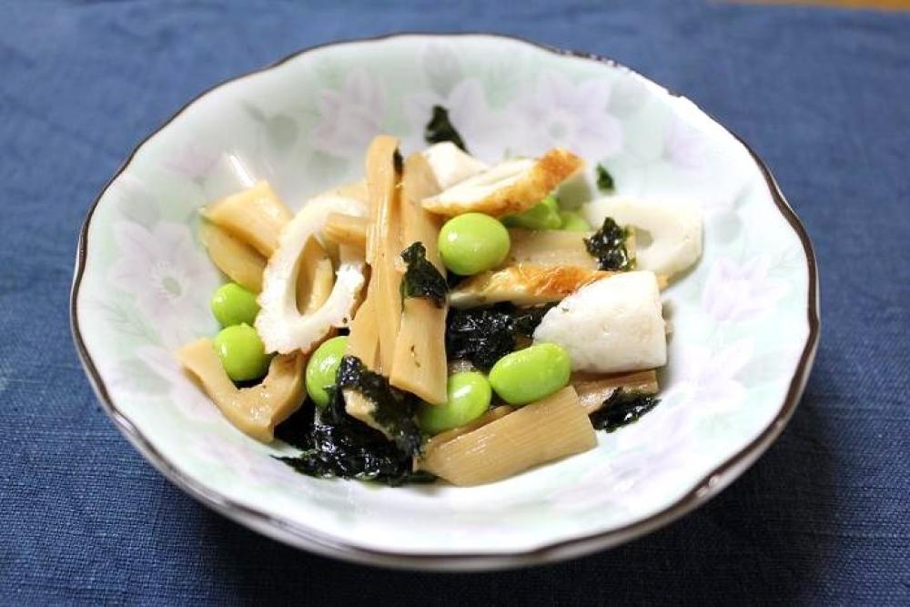 枝豆・味付けメンマ・ちくわ・韓国海苔・塩・ごま油を混ぜ合わせたら出来上がり。
