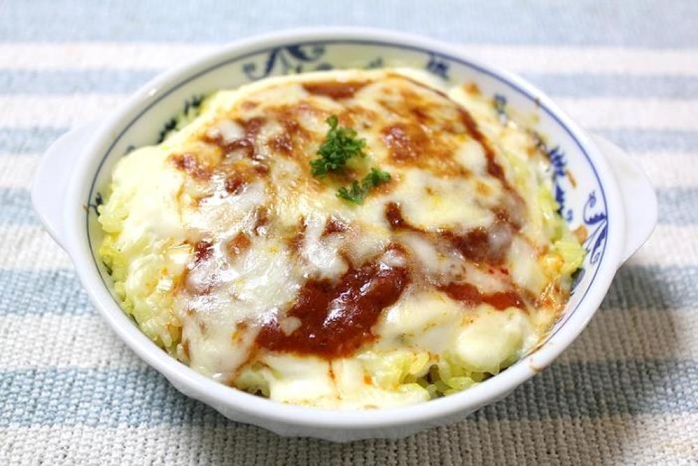 耐熱皿にサフランライス→ホワイトソース→ミートソース→とろけるチーズ(5等分)の順にのせていきます。