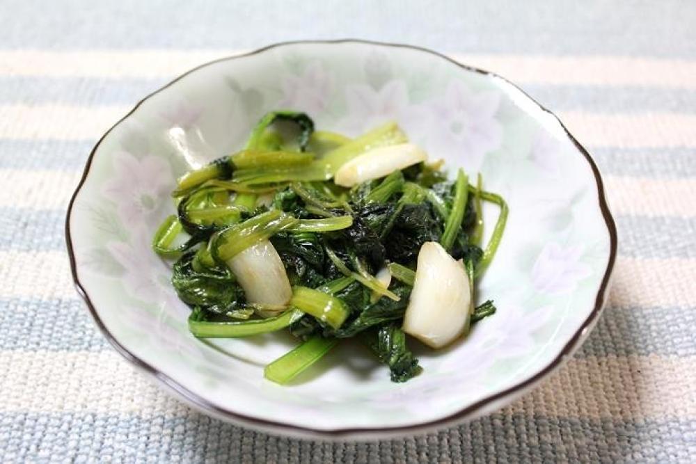 香り出しをしたら、ビタミン菜を加えて炒め、オイスターソースを加えて軽く炒めたら出来上がり。