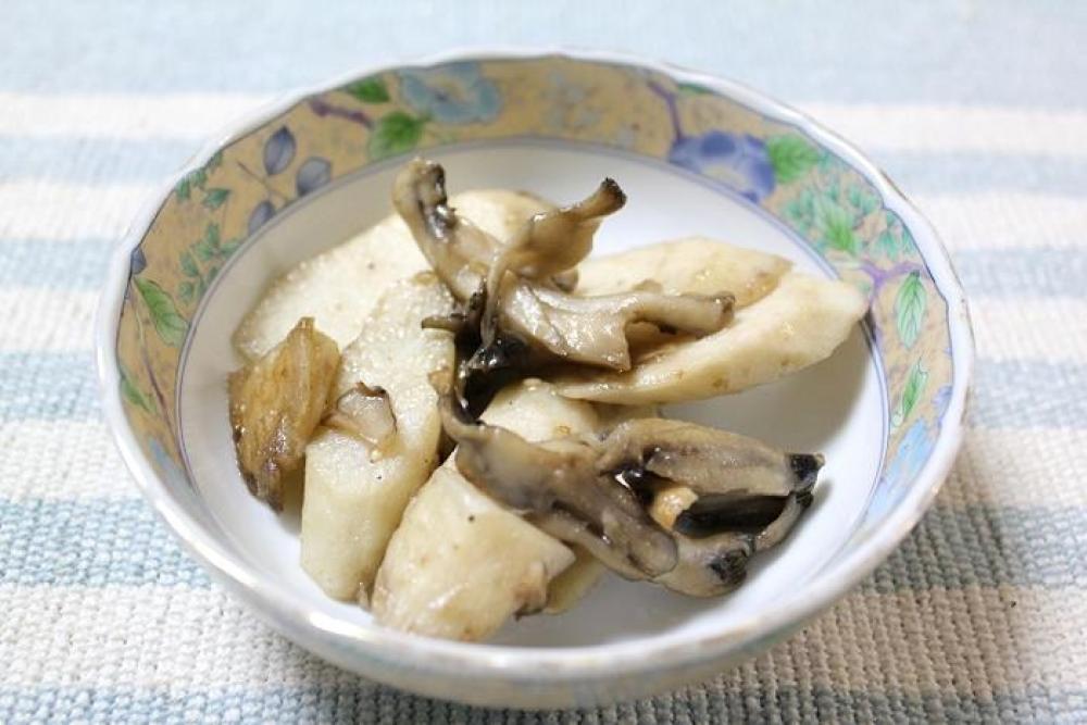 油を熱したフライパンで長芋・舞茸を炒めます。