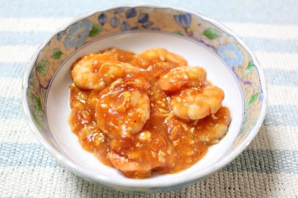 エビを加えて炒め、色が変わったら、ケチャップ・豆板醤・砂糖・酢・塩・鶏がらスープを加えて炒めます。