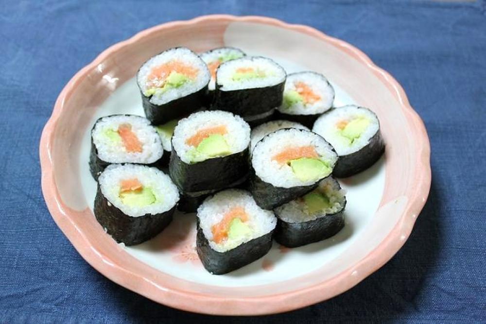 海苔に酢飯・サーモン・アボカドをのせ、巻きすで巻いたら出来上がり。