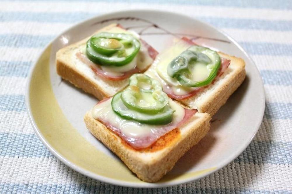 輪切りにしたピーマンと4等分にしたスライスチーズをのせ、オーブントースターで5分焼いたら出来上がり。