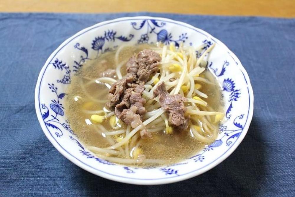 豆もやしを加えて2~3分ほど炒めたら、鶏がらスープを加えて煮立てます。
