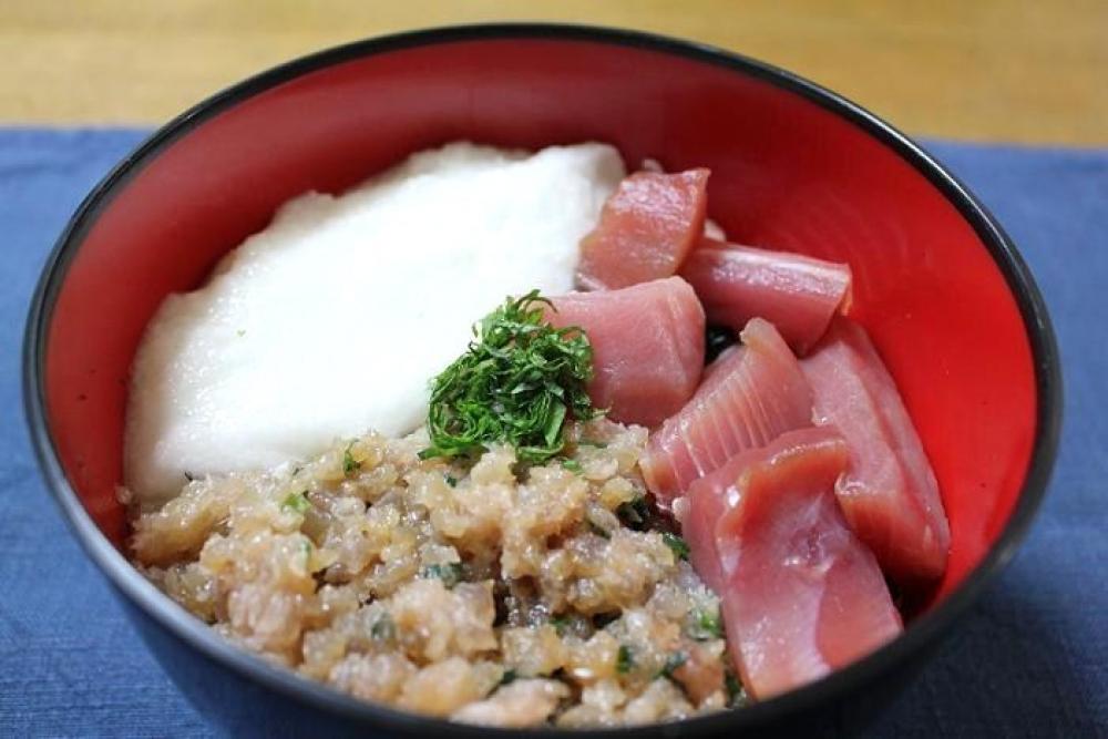 酢飯を器に盛り、まぐろ・ねぎとろ・とろろをのせ、刻んだ青じそをのせたら出来上がり。
