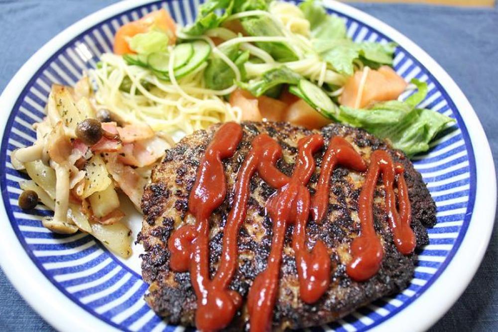お皿にハンバーグを盛りつけ、ケチャップを適量かけたら出来上がり。