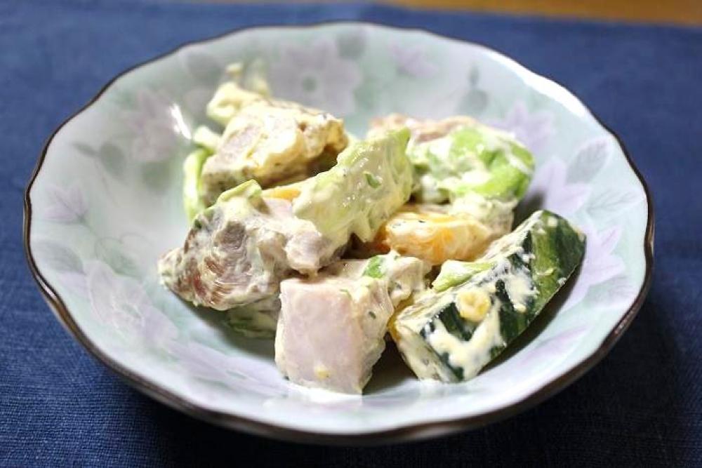鶏肉・かぼちゃ・ちぎったレタス・マヨネーズ・ラー油 を混ぜ合わせ、パセリを散らしたら出来上がり。
