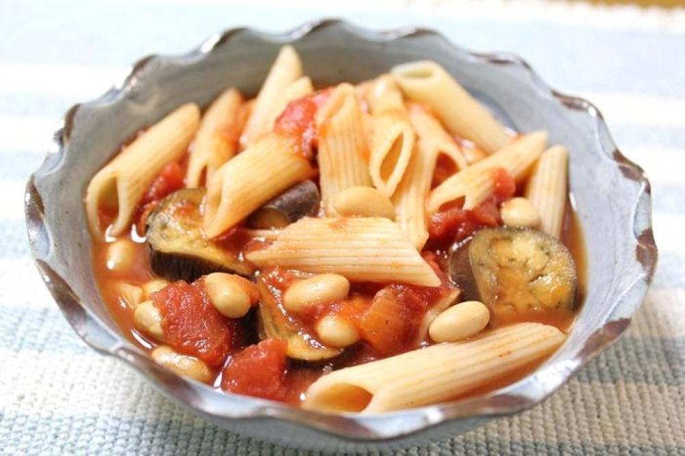 鍋にトマト缶・水・5mm間隔に輪切りしたなすを入れて煮立てます。