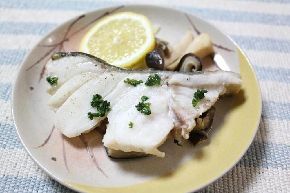 約7分ほど蒸し煮したらお皿にのせてレモン汁をふり、レモンスライスを添えたら出来上がり。