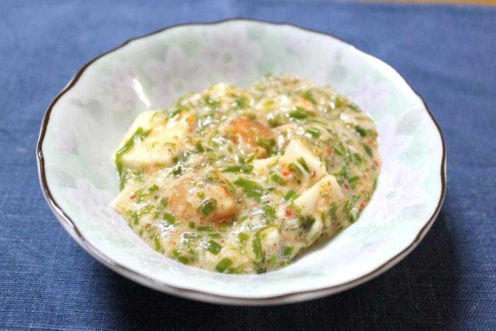 長芋は皮を剥いて半分をとろろ状にし、残りの半分を角切りにします。